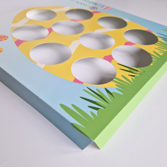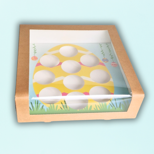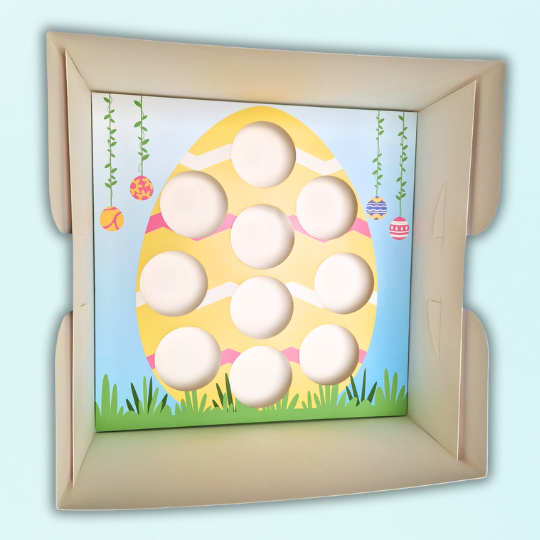 Of je nu cupcakes bakt voor een paasbrunch, traktatie, cadeautje of gewoon als vrolijke eyecatcher in de vitrine: met deze speelse Paas-inlegger worden cupcakes een feest om te geven én om te krijgen. De inlegger is vormgegeven als een kleurrijk paasei, versierd met speelse pastelkleuren, hangende eitjes en gras onderaan. Geschikt voor 10 standaard cupcakes en direct klaar om uit te delen, zonder extravagante decoratie nodig te hebben.